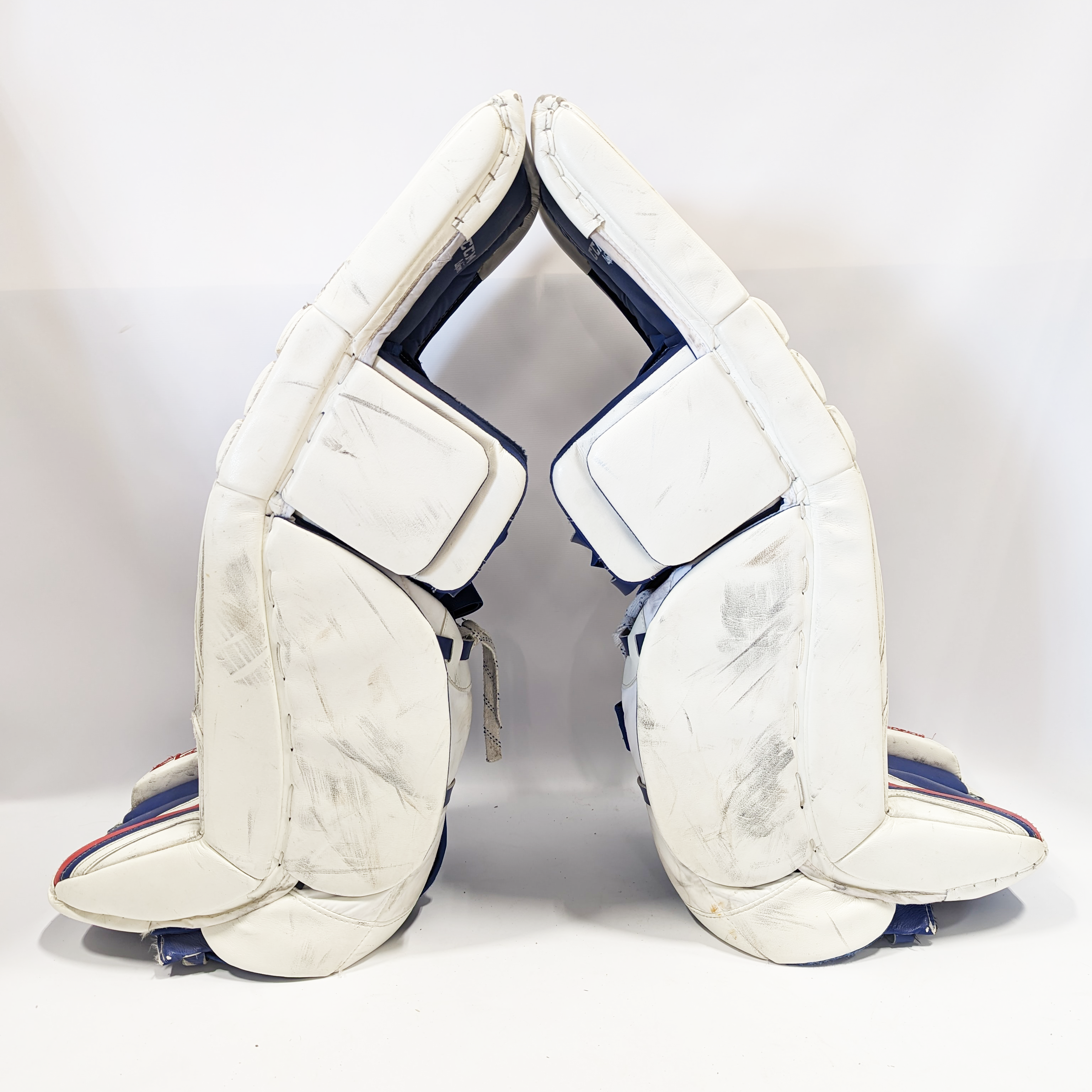Il s'agit d'un ensemble de jambières de gardien de but Pro Stock d'occasion en très bon état. Le seul point faible est une couture sur la partie supérieure intérieure de la jambière droite (photo). Sinon, le cuir présente de légères traces d'usure et de légères marques de rondelle.