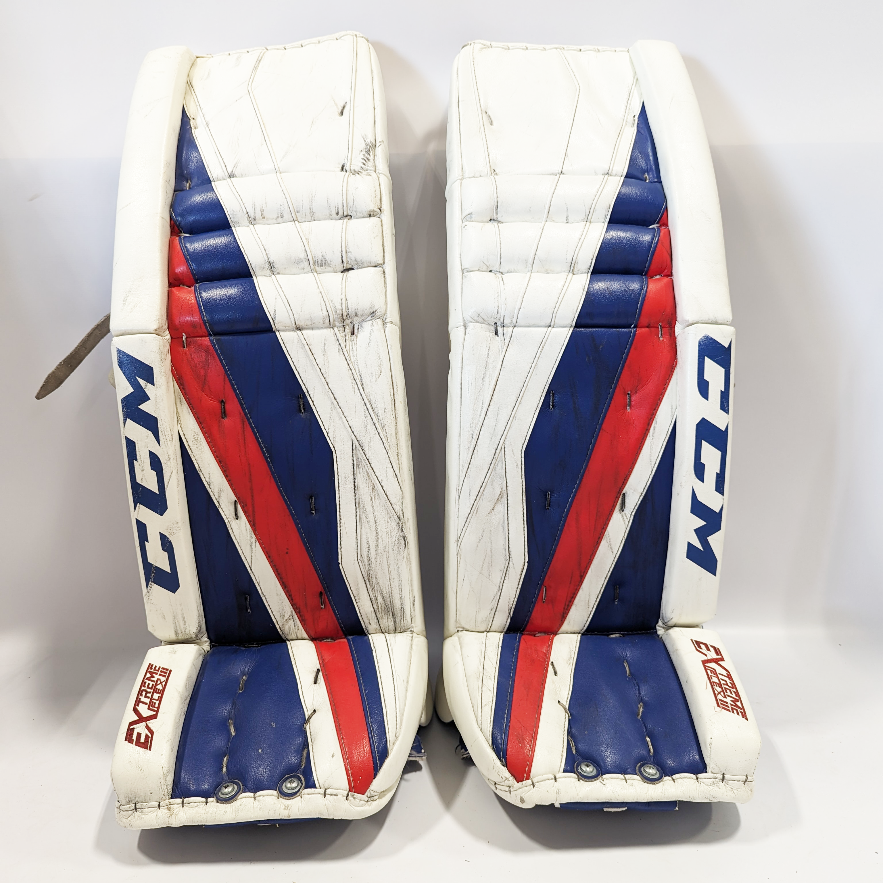 We work hard to source the absolute best deals for our customers, like this CCM Extreme Flex III - Jambières de gardien de but Pro Stock d'occasion (blanc/bleu/rouge)