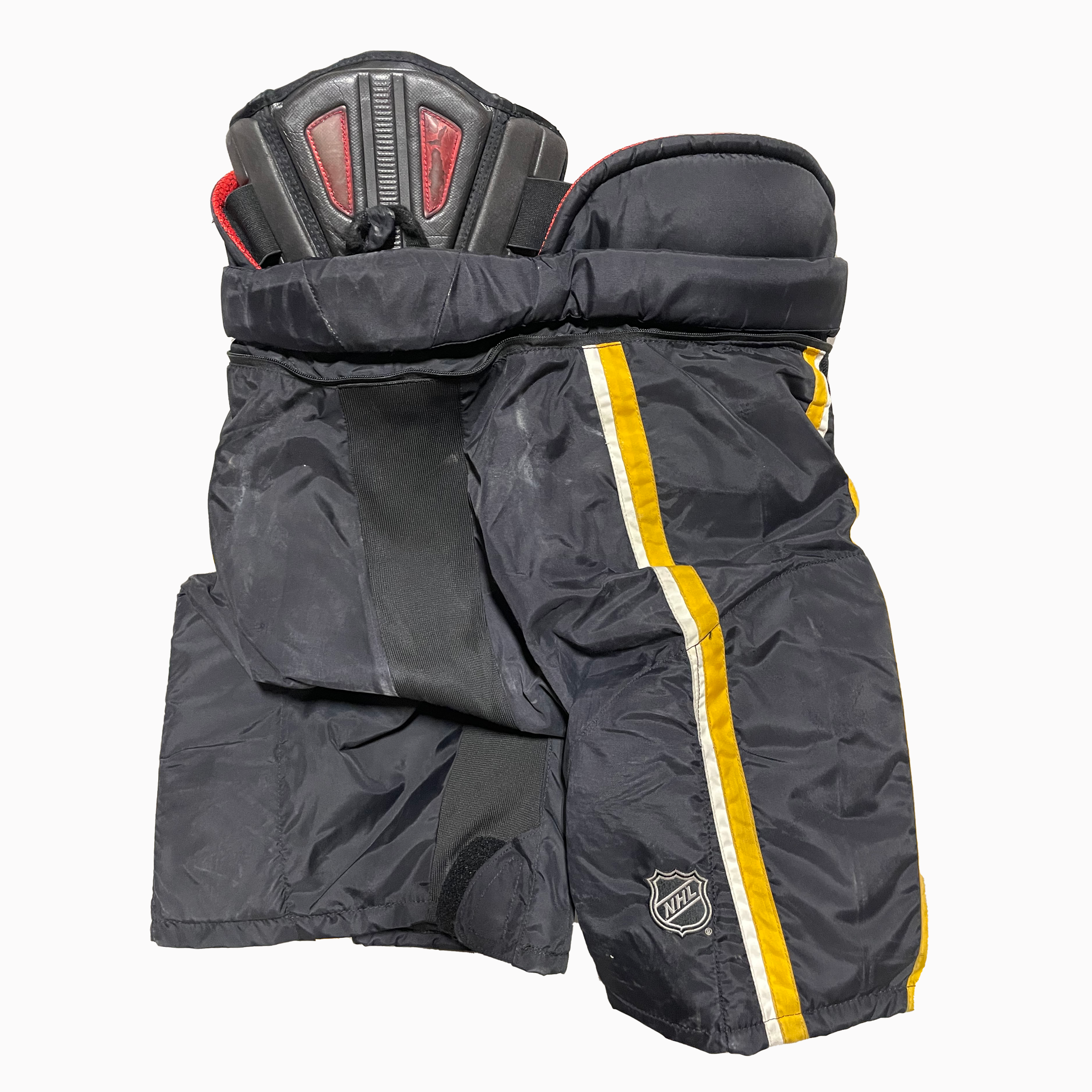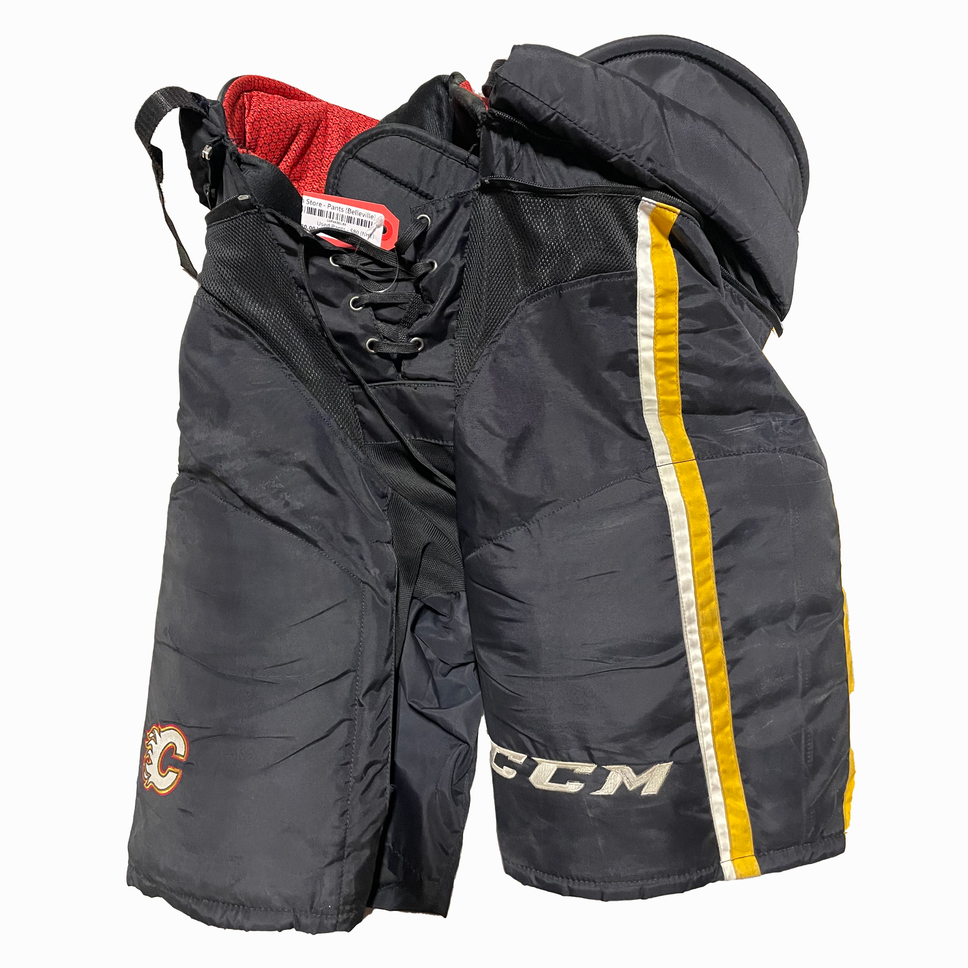 We work hard to source the absolute best deals for our customers, like this CCM HP45 - Pantalon de hockey Pro Stock d'occasion - Flames de Calgary (noir/blanc/jaune)